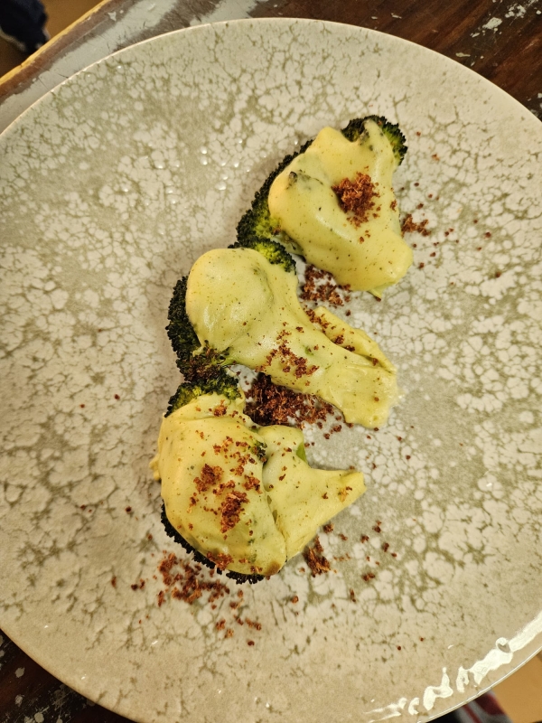 9- BROCOLI GRATINADO CON BECHAMEL DE BROCOLI Y POLVO DE JAMÓN